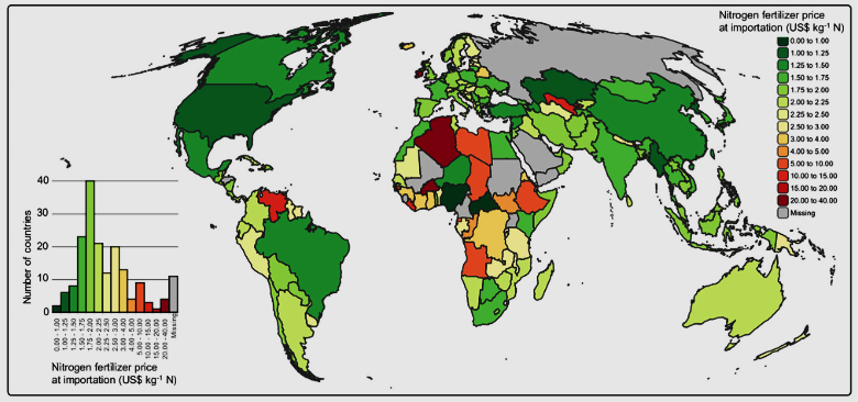 Figure 1: Prices of N in imported mineral fertilizers by country at a global scale. Costs of conventional fertilizers vary greatly at a global scale suggested by price per unit N at importation (averages of all N-bearing fertilizers from https://www.fao.org/faostat/en/) indicating the greatest opportunities for CBE for offsetting fertilizer costs (retail or whole-sale prices for fertilizers are not available by country at a global scale from IFASTAT and FAOSTAT).