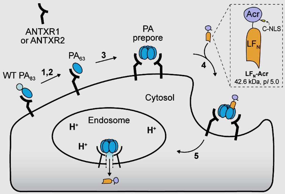 Mechanism of the anthrax protective antigen (PA)-mediated delivery of LFN-Acr into cells. 1) Wild-type (WT) PA (i.e., PA 83 kDa: PA83) binds to the ANTXR1 or ANTXR2 receptors on the cell surface. 2) Cell-surface proteases cleave and activate receptor-bound PA83. 3) The activated PA (i.e., PA 63 kDa: PA63) oligomerizes into a prepore. 4) The nontoxic N-terminal domain of lethal factor (LFN) in the LFN-Acr fusion binds to the PA prepore. 5) The entire complex is endocytosed. Acidification of the endosome promotes the PA prepore to change into a transmembrane pore, which translocates LFN-Acr into the cytosol.